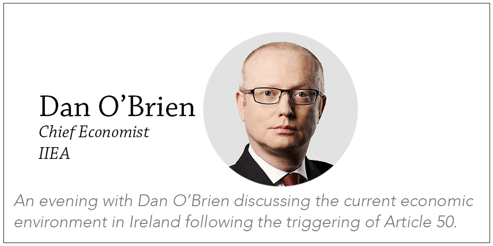 Please click here to book your ticket. Join us for an evening with Dan O'Brien, Chief Economist at the Institute of International and European Affairs, to discuss the current economic environment in Ireland and the impact of Brexit following the triggering of Article 50.