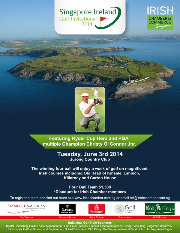 The Annual Christy O'Connor Singapore-Ireland Golf Invitational will take place on Tuesday, June 3rd at Jurong Country Club. Ryder Cup Hero and PGA multiple Champion Christy O'Connor Jnr. will be on hand to play a hole of golf with participants and it promises to be a super day out again.